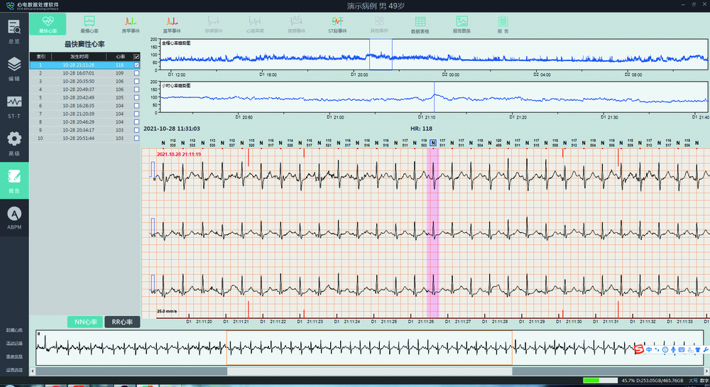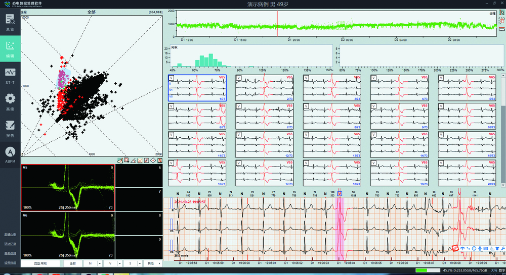 将直方图、心率趋势图、时间散点图和可编辑散点图同屏显示,患者情况一目了然